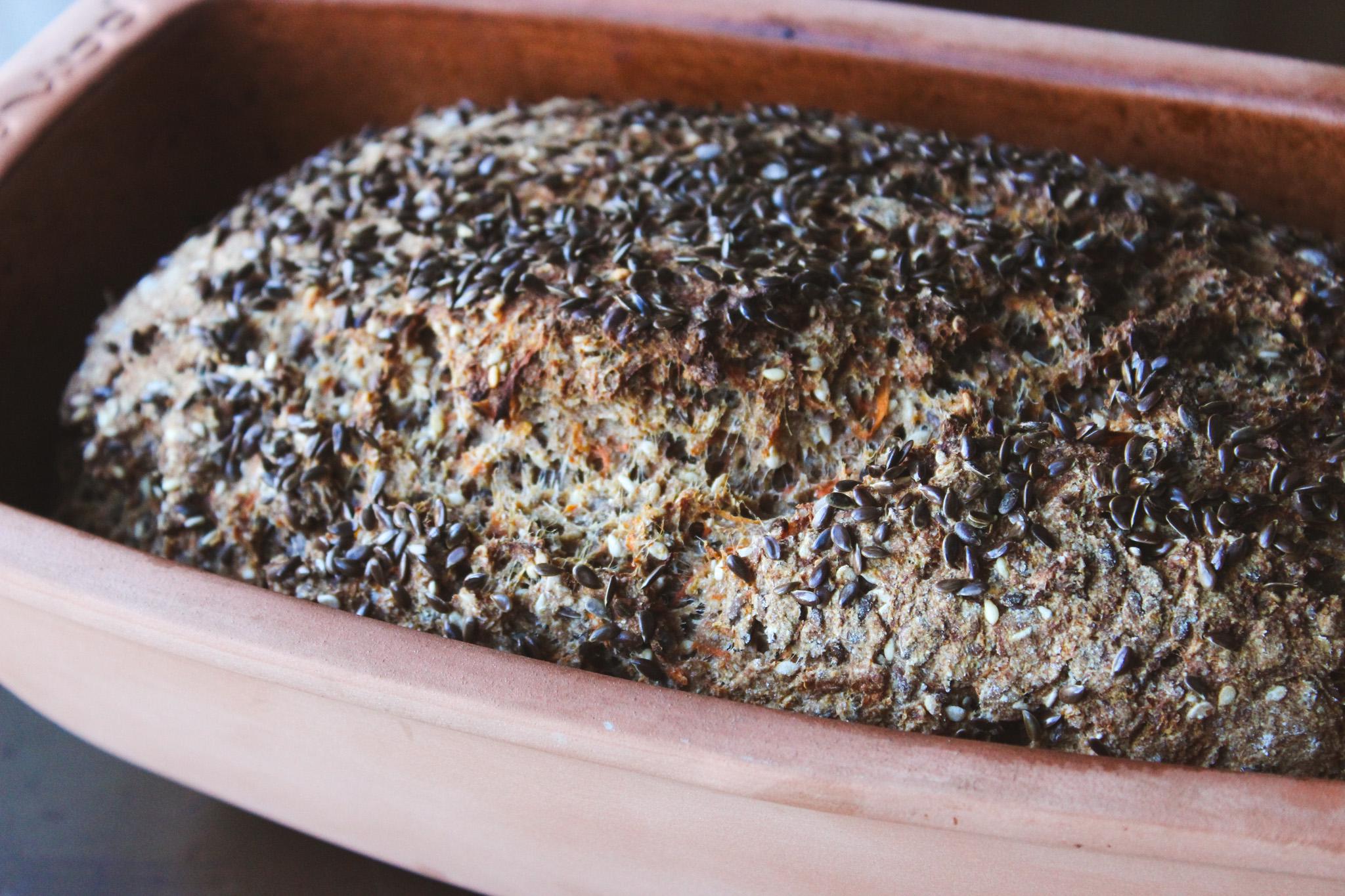 What Makes It Special Our rustic dark loaf starts with premium whole wheat flour and is generously loaded with a medley of nutritious seeds and grains. Every slice delivers the satisfying crunch of sesame, sunflower, and pumpkin seeds, complemented by the subtle nuttiness of flax and the omega-rich goodness of chia seeds. We add freshly grated carrot to each loaf, which not only provides natural beta-carotene, vitamins A and E, but also keeps the bread beautifully moist and adds a subtle sweetness that balances the earthy grain flavors.